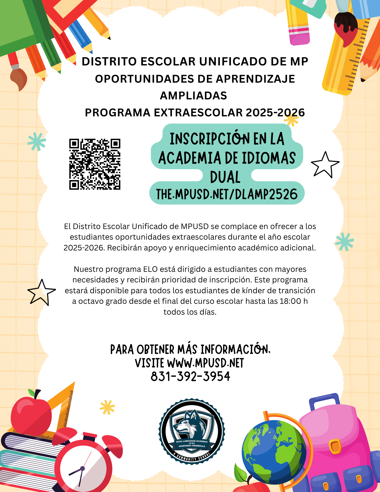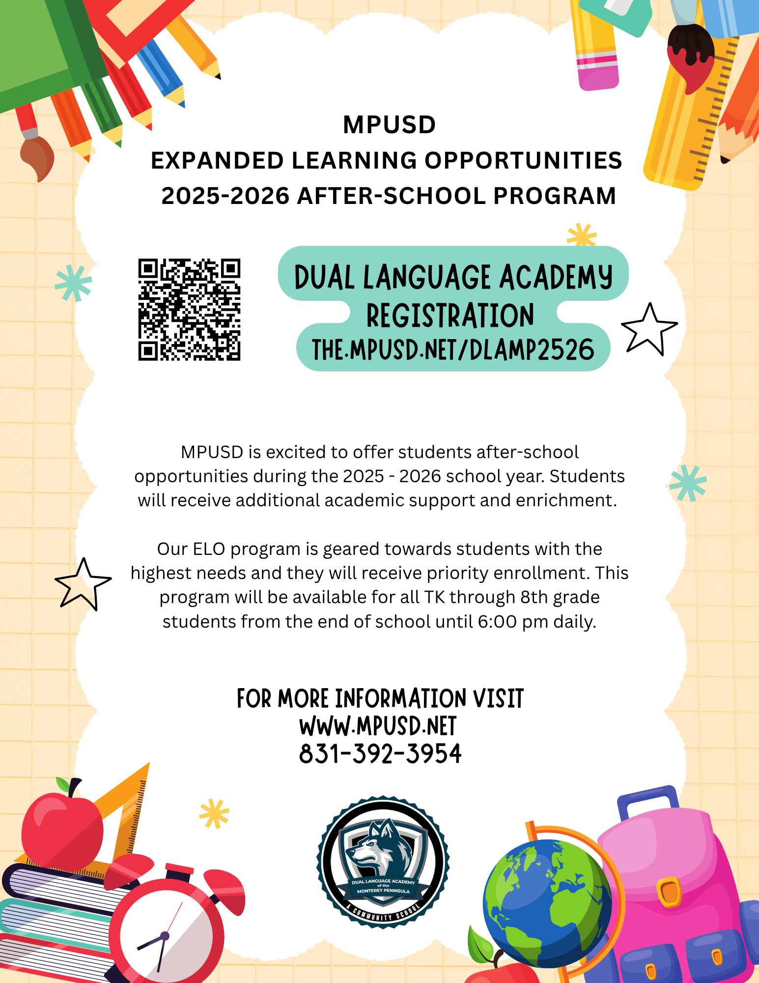 Monterey Peninsula USD is excited to offer full Expanded Learning Opportunities (ELO) afterschool programs at all TK-8 schools. Please see the links embedded in this message for access to the Registration application. Each link is unique to the school your child currently attends.